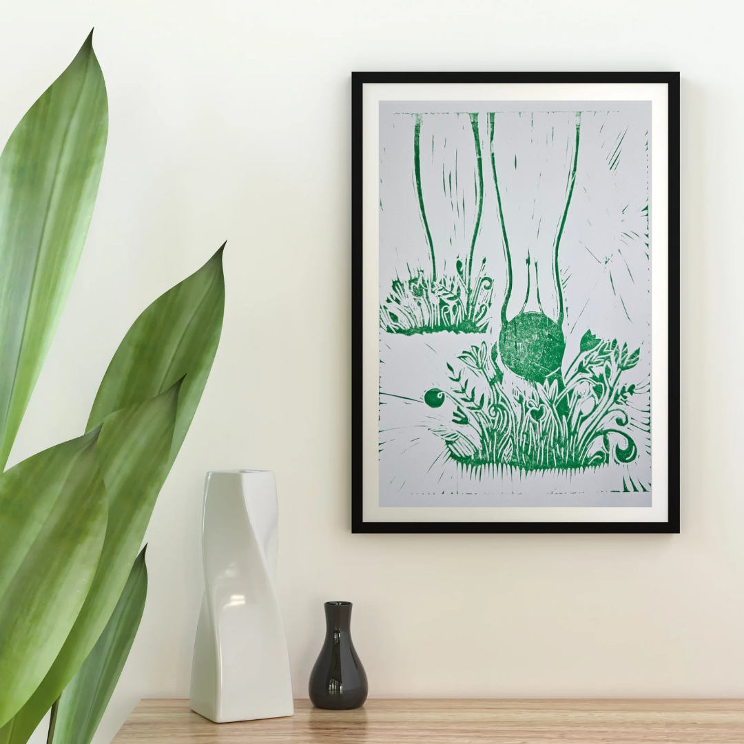 Perfect for lovers of lino and soft cut printing, nature inspired art, and wheel of the year inspired prints, this piece celebrates movement, spring, imbolc, and the simple joy of the first shoots of the year pushing through cold ground. The evocative print alludes to faith in the seasons, and the joy and reassurance of springs return.